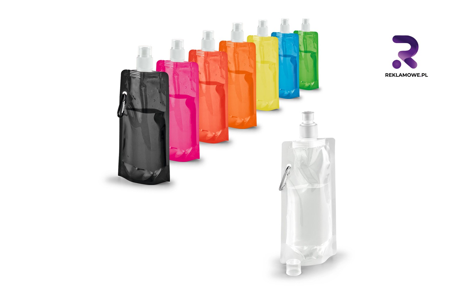 - Składane butelki silikonowe – po opróżnieniu zwijają się w kompaktowy krążek, który można przypiąć karabińczykiem do plecaka. Klienci cenią taką mobilną wygodę, a Twoje logo wędruje z nimi w świat.