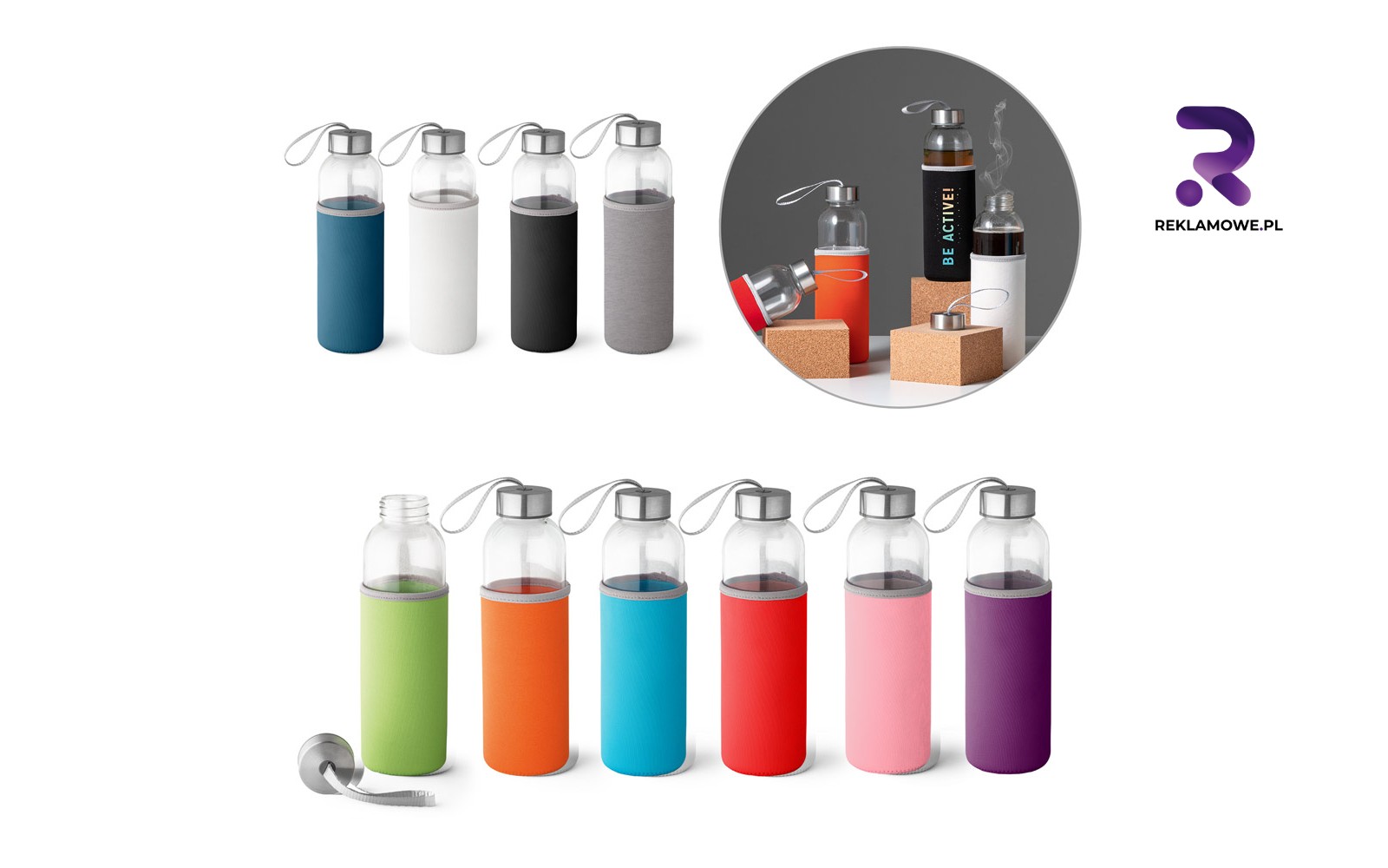 - Szklane butelki premium – borokrzemowe szkło podkreśla ekologiczny charakter upominku, a kolorowy rękaw z silikonu chroni przed stłuczeniem. To sposób, by kojarzyć firmę z jakością i designem z wyższej półki.